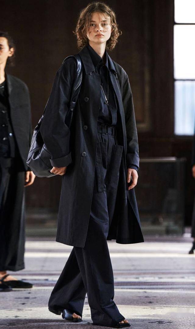 纵向线条感的长风衣+长裤,可以轻松拉长身形比例,显瘦又显高,配双鱼嘴粗跟鞋,造型更轻盈。