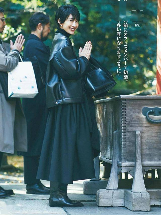 挺阔有型的皮夹克,被伞裙烘托出了柔和之美,戴对金色耳环,又增添了一丝贵气感,又美又飒!