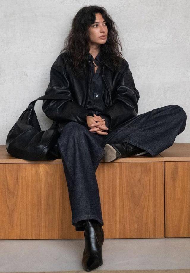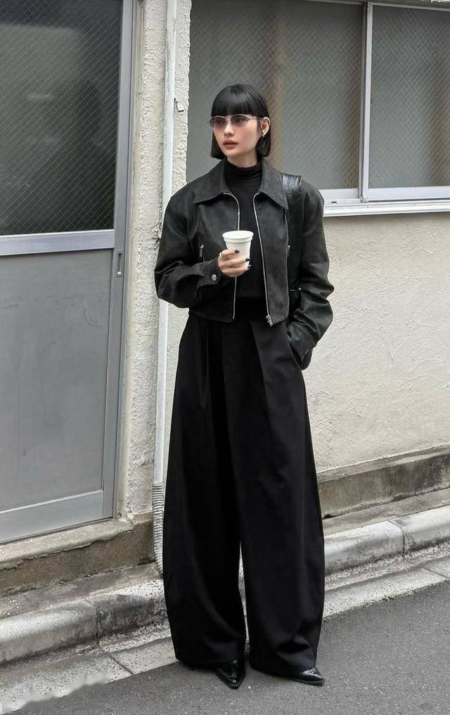 黑色皮衣最适合玩转“一身黑”的穿法,搭配黑色牛仔阔腿裤,帅气和休闲的碰撞,平添了几分腔调。