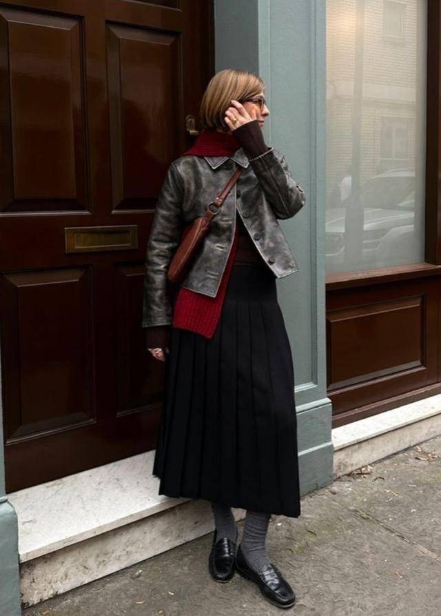 身穿黑色皮衣,搭配黑色百褶长裙,想要破局,就要戴条红围巾,让造型呈现出层次之美,规避沉闷感。