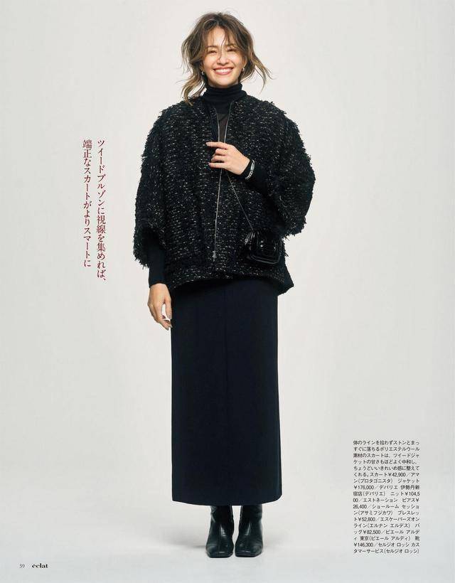 肌理感十足的小香风外套,和黑色是天生一对,搭配直筒版型的黑色长裙,“繁简结合”尽显平衡感。