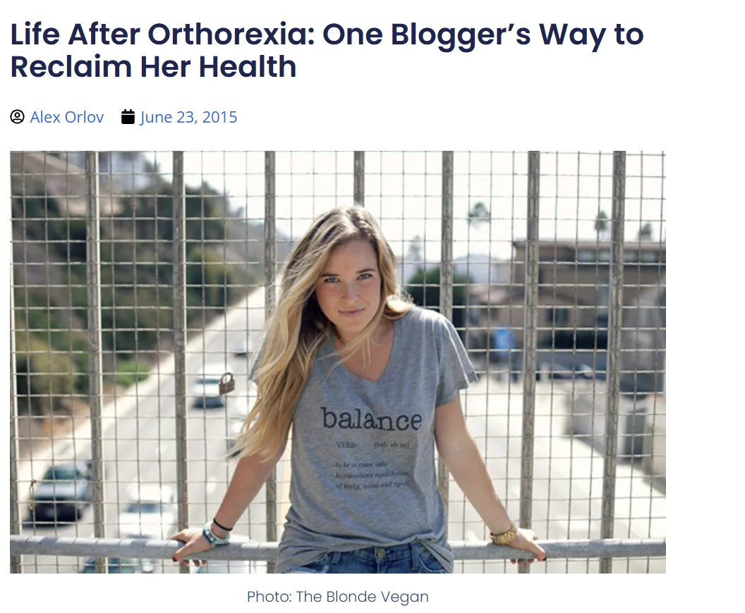 2013年,她凭借果蔬汁、生食沙拉和干净饮食迅速走红。但随着她不断精简自己的食谱,只吃未经烹饪的素食,回避经过被加工后的肉蛋奶,很快便滑向了正食症,并出现停经、脱发、蛋白质严重匮乏等症状。