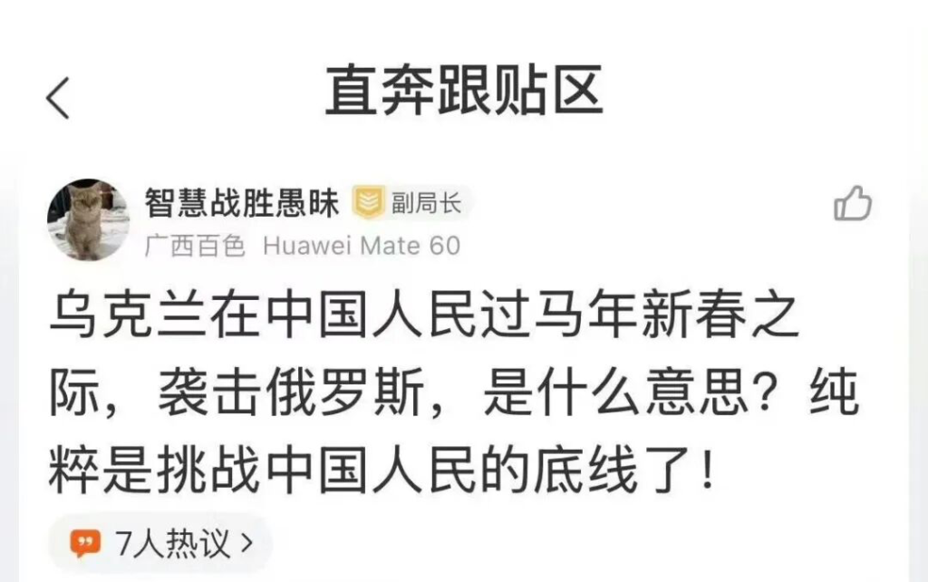 看下面这则帖子,它说,乌克兰在中国人民过马年新春之际,袭击俄罗斯,是什么意思?纯粹挑战中国人民的底线了!