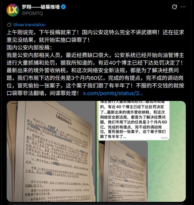 “国内公安内部投稿:我是公安内部相关人员,最近经费缺口很大,公安系统已经开始向油管博主进行大量抓捕和处罚,据我所知道的,有近40个博主已经下达处罚决定了!最新出来的境外营收纳税,和这次网络安全新法规,都是为了解决经费问题,我们市局下达的任务是3个月内60亿,完成的有提点,完不成的调动岗位,冒死偷拍一张案子,这个案子我们跟了有半年了!不服的不交钱的就按口袋罪非法翻墙,间谍罪处理!”