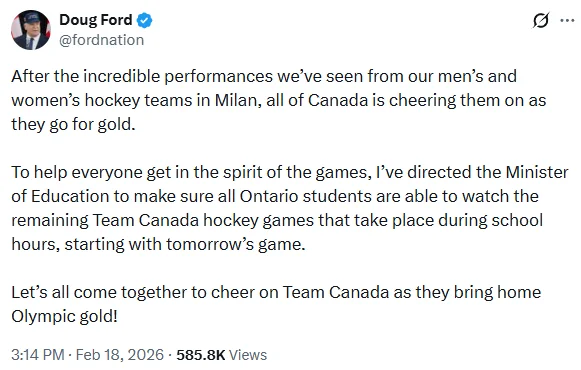 安省省长福特(Doug Ford)更是宣布自己已经指示教育厅长确保安省所有学生在课堂时间看加拿大女子冰球队对阵美国的奥运决赛,以及冬奥剩余的所有冰球比赛。多伦多街头、图书馆、酒吧更是到处是观赛派对。