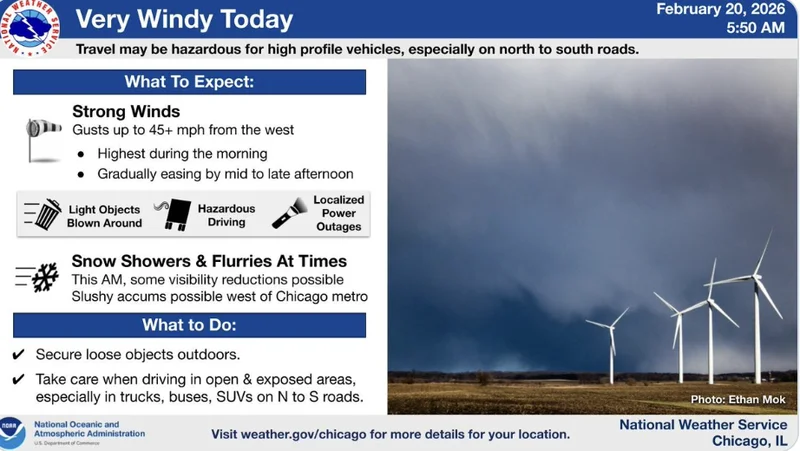 气象部门严正提醒民众,强劲的西风可能会吹散户外未固定的杂物,并导致树枝折断甚至引发局部电力中断。与此同时,一股来自西部的降雪云团正横扫该地区。虽然预计降雪量较小,但从清晨6点开始,从迪卡尔布县(DeKalb)到芝加哥市中心都将出现零星雪花。