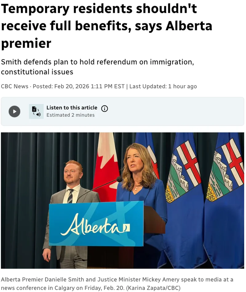 今天(2月20日)阿尔伯塔省省长丹妮尔·史密斯(Danielle Smith)为限制非永久居民提供政府福利的提案辩护,再次强调临时居民不应享受全部福利。
