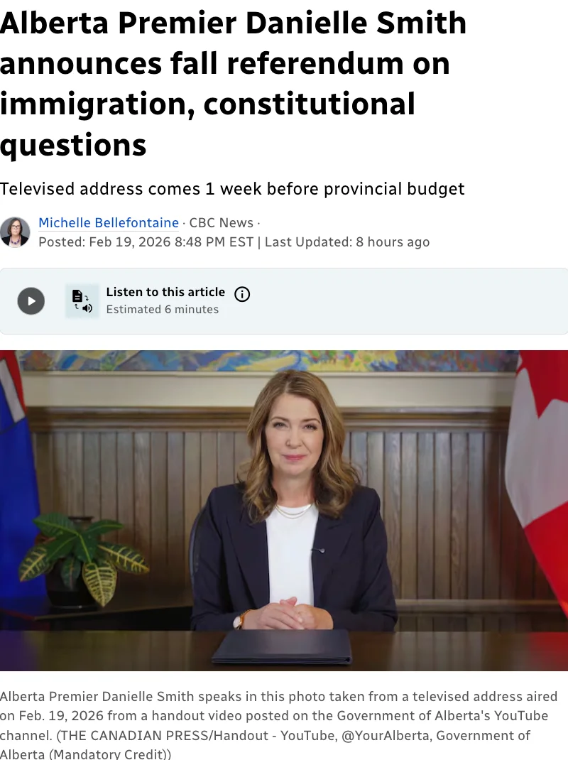 在周四晚间发表的13分钟电视讲话中,史密斯表示,她希望阿尔伯塔省的选民在10月19日就九个问题进行投票,其中前5条的移民问题,后4条是修宪问题。
