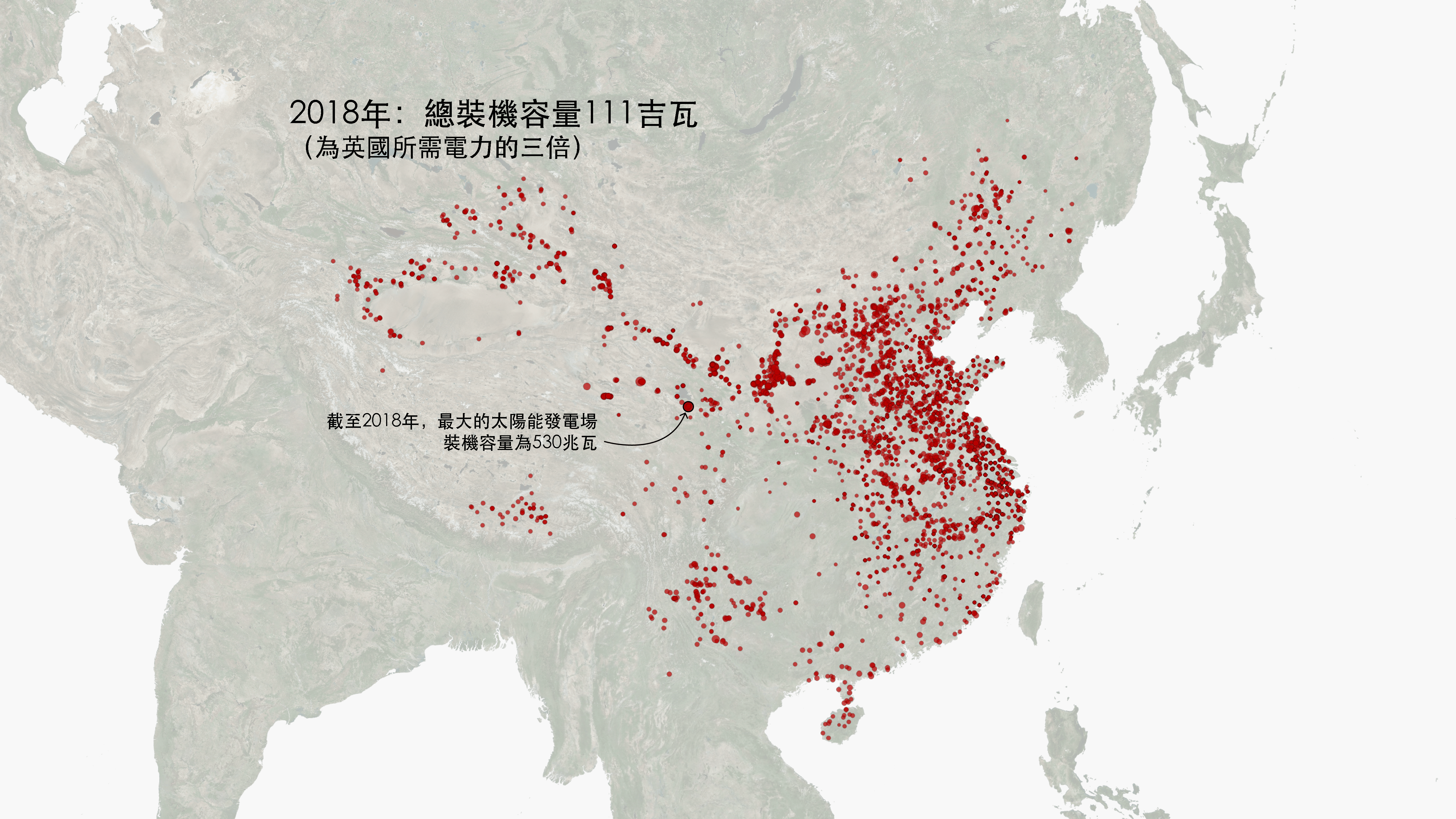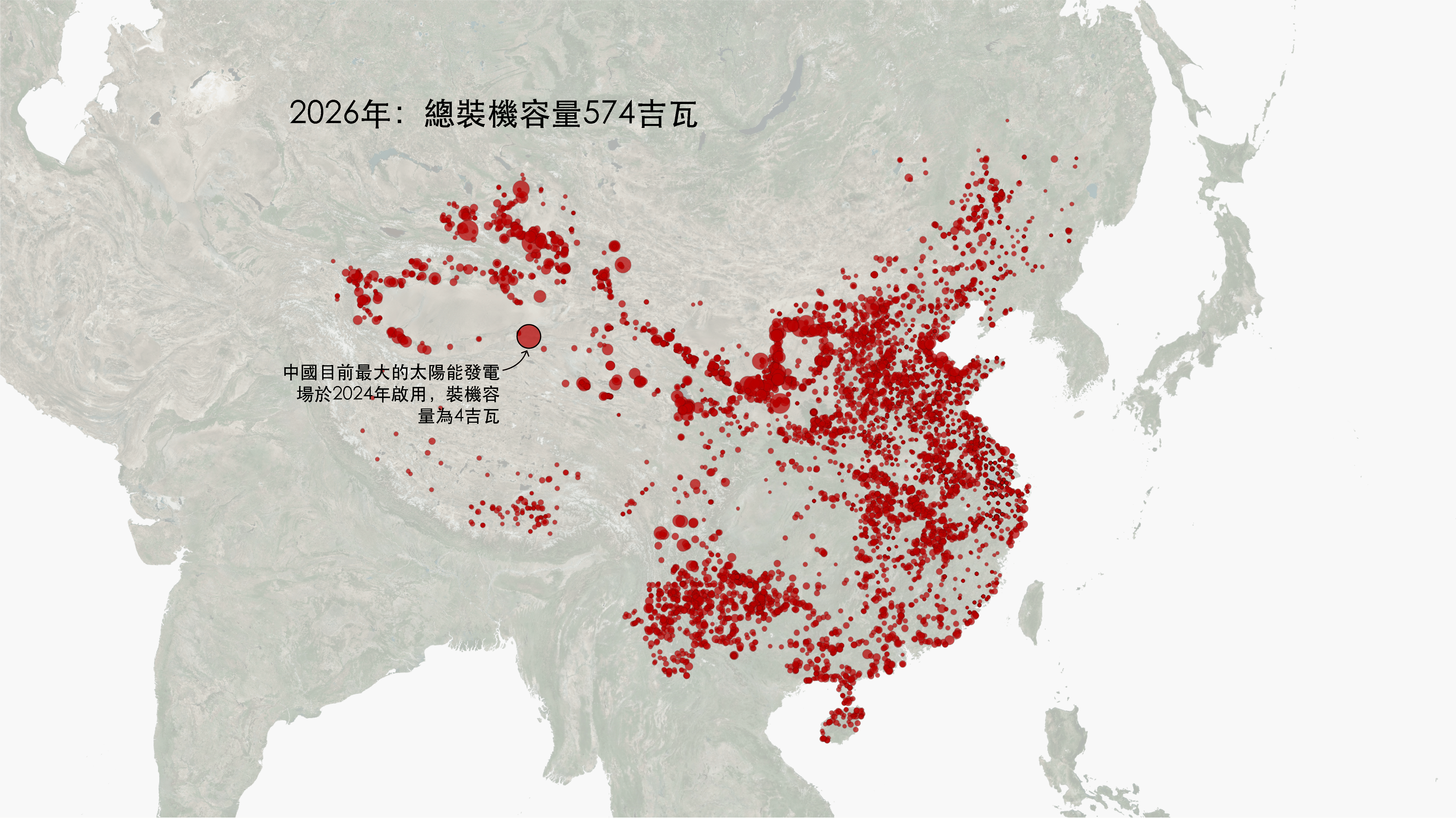 在甘肃和新疆,连绵起伏的山丘与广阔平原,已转变为大型风电和太阳能基地。闪耀的矽晶太阳能板排列在风力发电机下方,发电量足以为数以千万计的家庭提供电力。