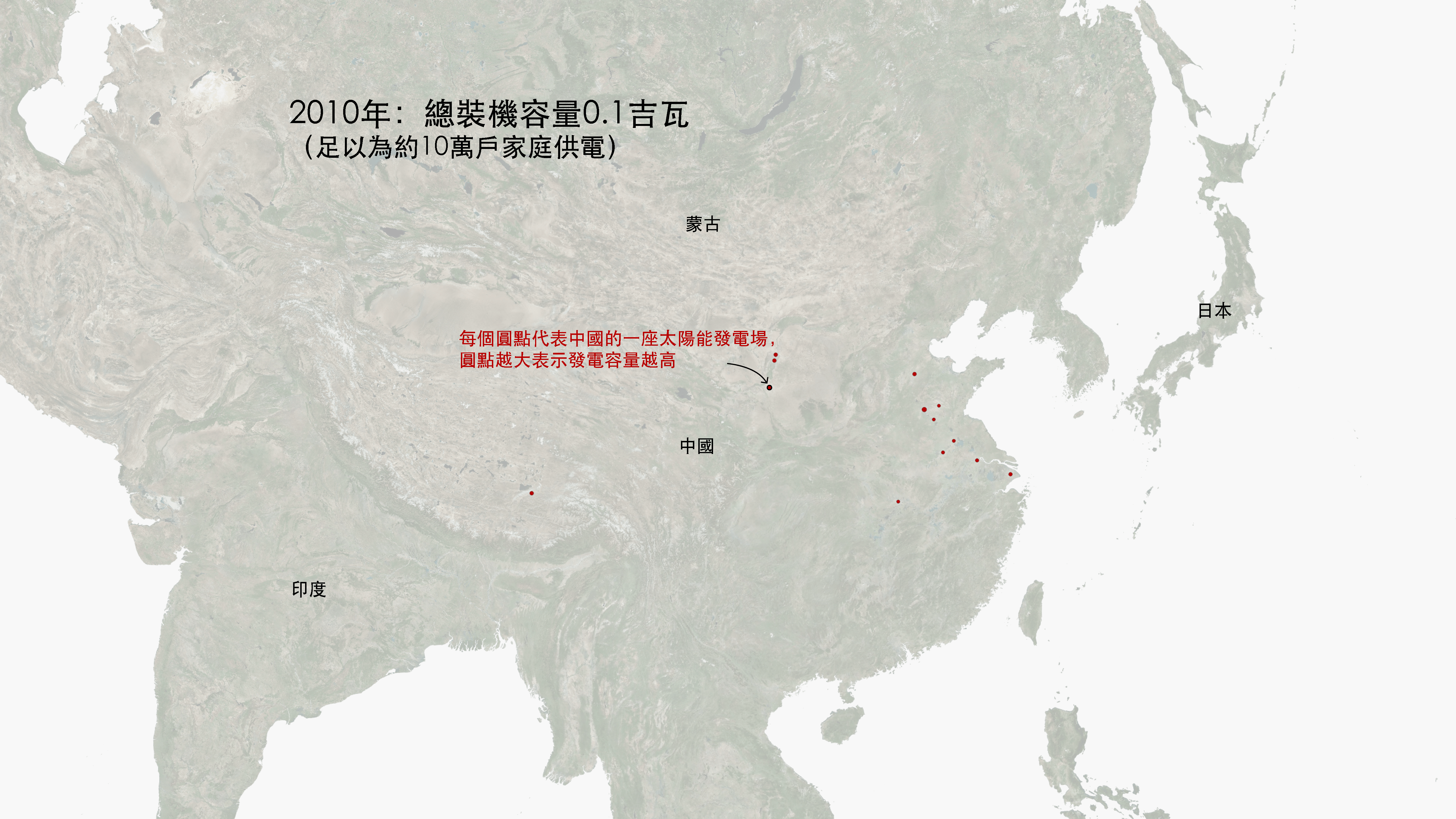 当时中国只有寥寥数座大型太阳能发电场,合共提供约0.1吉瓦的电力。不同估算略有差异,但这大致足以为约10万户家庭供电。