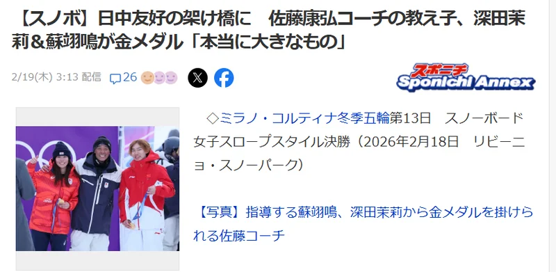 日媒在赛后迅速跟进报道,用了一个意味深长的标题,说“雪板架起了日中友好的桥梁”。佐藤康弘在采访里也很坦率,他提到如今复杂的国际氛围,提到中日关系的紧张,却也直言:“能在这样的背景下,和中国选手一起拿到金牌,还能在日本被报道,这对我来说意义很大......”