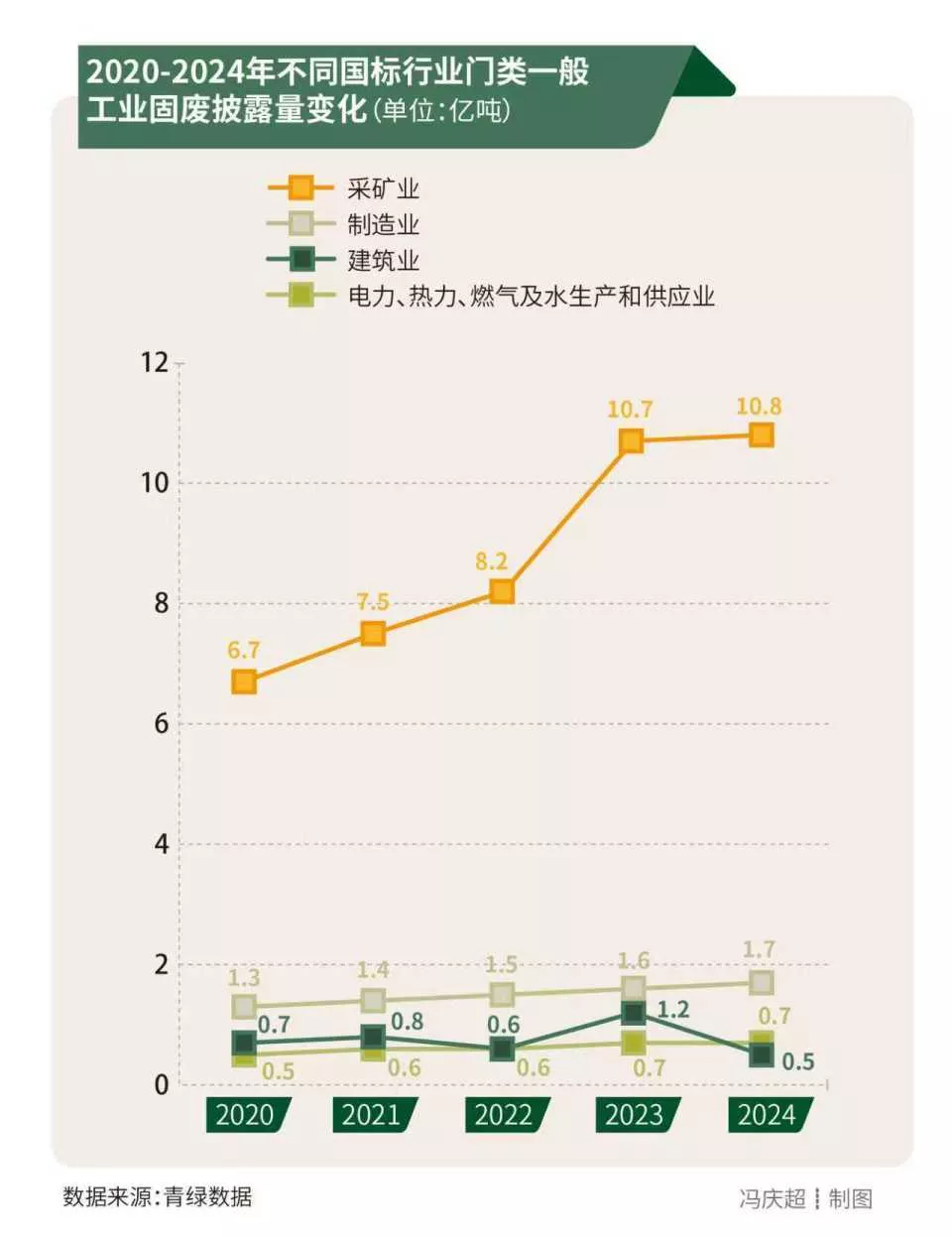从行业来看,南方周末绿色研究中心按照国标行业门类,对连续5年披露一般工业固废的220家A股上市公司统计发现,披露量靠前的国标行业门类依次为“采矿业”“制造业”“建筑业”“电力、热力、燃气及水生产和供应业”(累计披露量分别为44亿吨、7.4亿吨、3.8亿吨、3.1亿吨),其中,采矿业一般工业固废披露量在所有行业门类中绝对领先,并逐年快速增长,年均增幅高达12.7%。