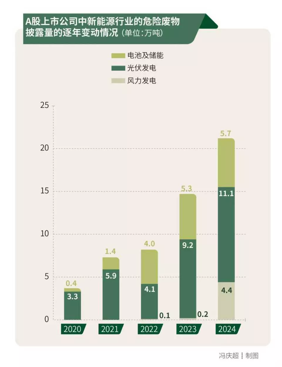 从危险废物的角度观察,光伏发电、电池及储能、风力发电的披露量均呈现波动增长的趋势。其中,光伏发电的危险废物披露量从2020年的3.3万吨增长到了2024年的11.1万吨,电池及储能的危险废物披露量从2020年的0.4万吨增长到了2024年的5.7万吨,风力发电危险废物披露量从2020年的0万吨增长到了2024年的4.4万吨。