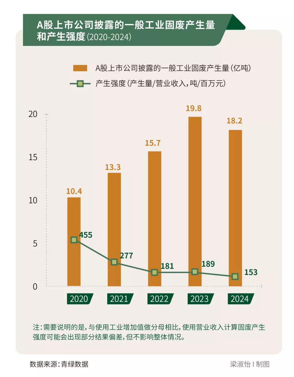 为进一步探究产废情况,南方周末绿色研究中心参照《“无废城市”建设指标体系(试行)》《深圳证券交易所上市公司自律监管指南第3号——可持续发展报告编制(2026年修订)》及A股上市公司披露习惯,给出固体废物产生强度指标:“吨/百万元”。计算方法为该类固体废物产生量/该上市公司当年度营业收入。