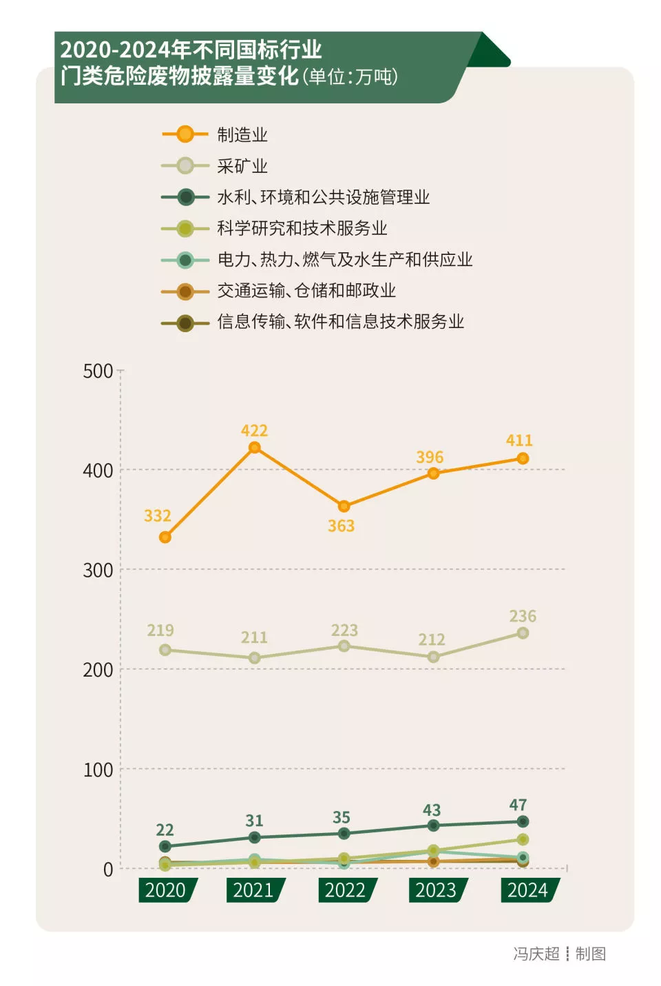 从行业来看,南方周末绿色研究中心按照国标行业门类,对连续5年披露危险废物的239家A股上市公司统计发现,排序靠前的行业门类依次为“制造业”“采矿业”“水利、环境和公共设施管理业”“科学研究和技术服务业”“电力、热力、燃气及水生产和供应业”“交通运输、仓储和邮政业”和“信息传输、软件和信息技术服务业”,累计披露量依次为1923万吨、1101万吨、179万吨、67万吨、46万吨、34万吨和33万吨。其中,制造业的危险废物披露量在所有行业门类中绝对领先,并逐年快速增长,年均增幅约5.5%。