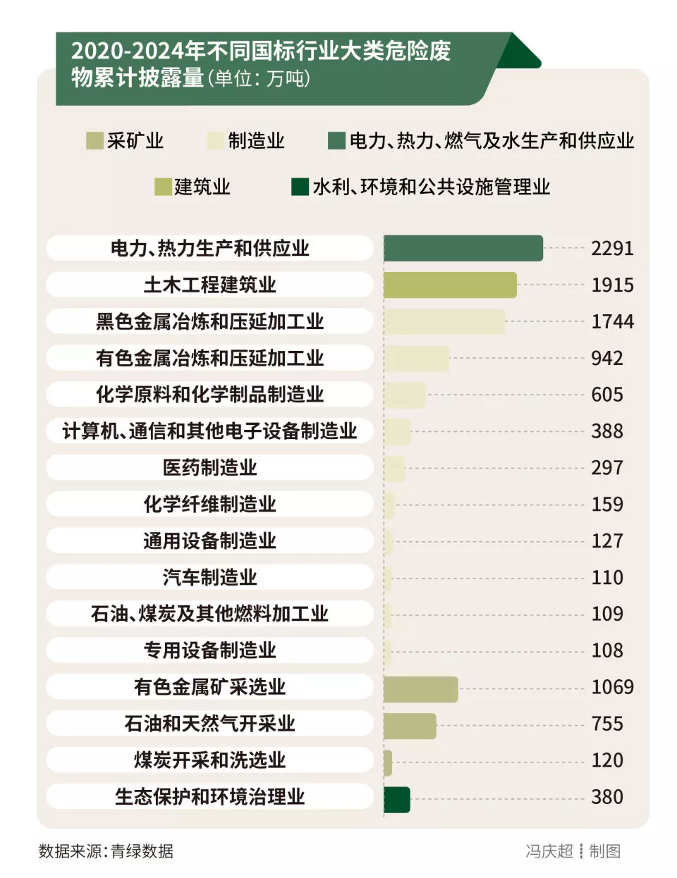 将国标行业门类细分到行业大类上,可以看到电力、热力生产和供应业是危险废物产生量的“大户”。五年间,16个行业大类危险废物披露量超2000万吨,其中“电力、热力生产和供应业”“土木工程建筑业”“黑色金属冶炼和压延加工业”“有色金属矿采选业”的披露量排序靠前,分别为2291万吨、1915万吨、1744万吨、1069万吨。