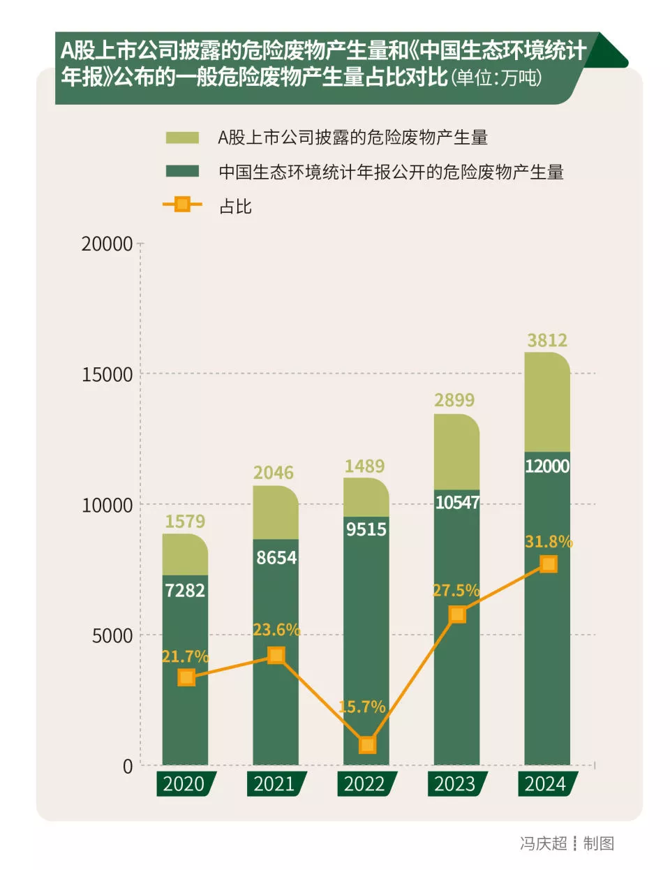 如果与《中国生态环境统计年报》公开的危险废物产生量相比,A股上市公司披露的产生量占比在2024年最高,达31.8%。五年间平均占比约为24.0%,略低于一般工业固废的情况。