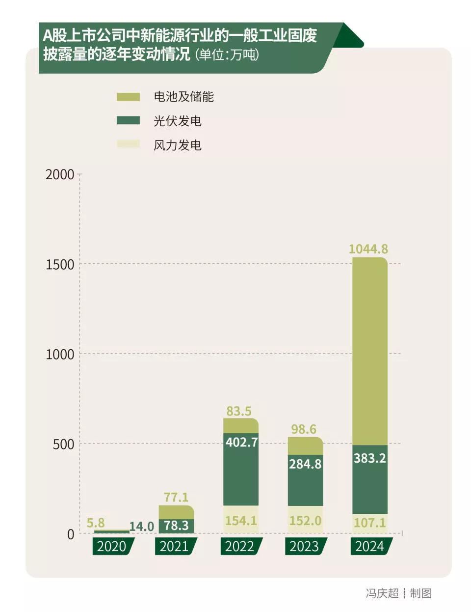 其中,电池及储能行业的A股上市公司一般工业固废披露量在2023—2024年之间的增幅最大,从98.6万吨猛增至1044.8万吨;光伏发电行业的A股上市公司一般工业固废披露量在2022年最高,为402.7万吨。值得关注的是,风力发电一般工业固废披露量则呈波动下降趋势,2022—2024年的披露量分别为154.1万吨、152.0万吨和107.1万吨。