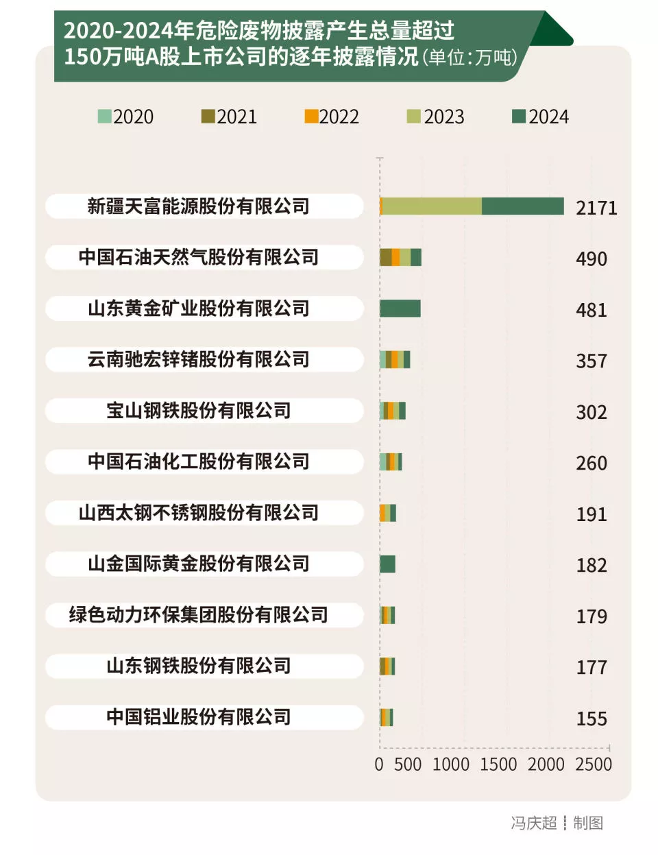 11家A股上市公司累计披露危险废物产生量超150万吨,新疆天富能源股份有限公司披露量最高,达2171万吨。值得注意的是,从时间维度看,11家公司中危险废物数据的披露量随着年份波动增长,其中2家公司是在2024年开始披露危险废物数据的。