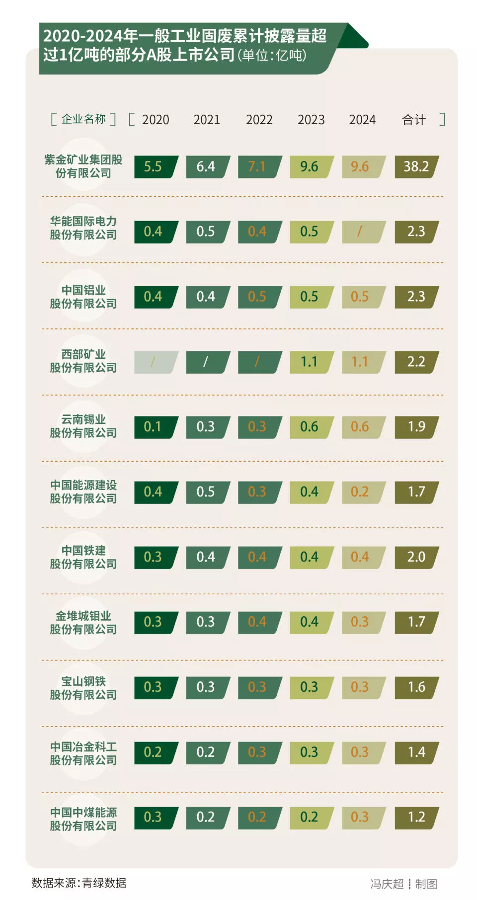 五年间,至少有11家A股上市公司一般工业固废累计披露量超亿吨,紫金矿业集团股份有限公司累计披露量最高,达38.2亿吨。
