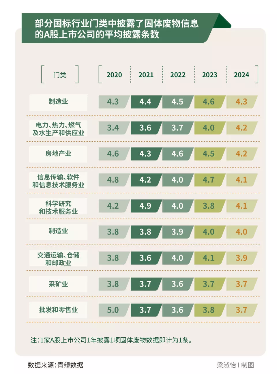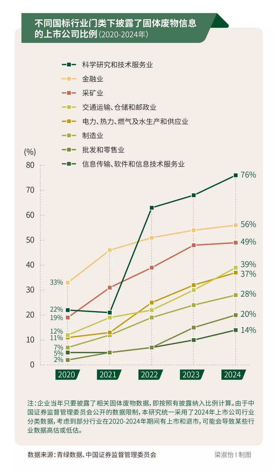 为了解“答卷”情况,南方周末绿色研究中心在数据库平台“青绿数据”的数据基础上,对2020年至2024年五年间曾在《可持续发展报告》(包括ESG报告、企业社会责任报告等)中披露固体废物数据的1659家A股上市公司(部分公司也在港股或其他交易所同时上市)的数据披露情况进行了详细分析。