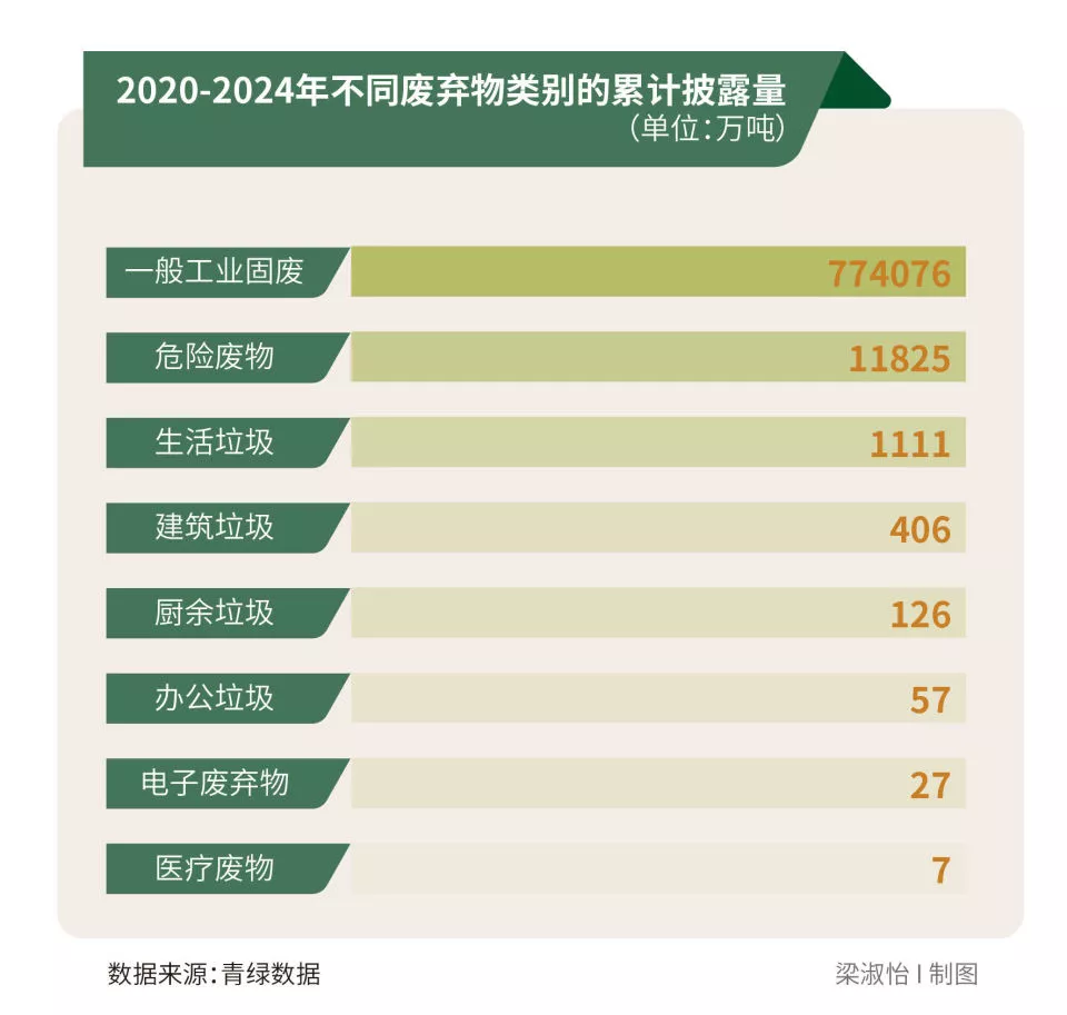 从披露的固体废物类别来看,2020—2024年,一般工业固废、危险废物披露量最大,分别高达774076万吨和11825万吨,二者占全部披露固废产生量的比例合计高达99.8%;生活垃圾披露量超千万吨,达1111万吨;建筑垃圾、厨余垃圾、办公垃圾、电子废弃物、医疗废物等各类固体废物披露量依次为406万吨、126万吨、57万吨、27万吨、7万吨。