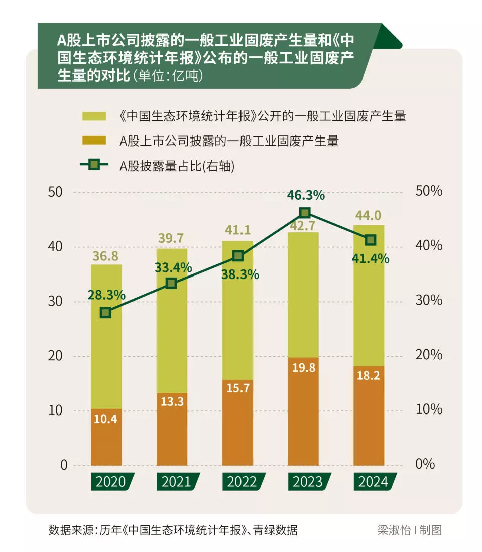 如果与《中国生态环境统计年报》公开的一般工业固废产生量相比,A股上市公司披露的产生量占比,2023年最高,达到46.3%,2024年回落至41.4%,五年间平均占比约为38.8%。