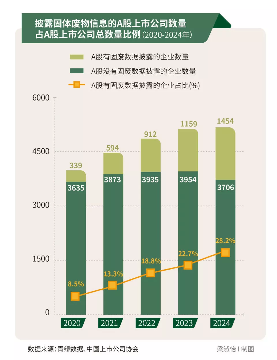 研究发现,五年间,共有1659家A股上市公司披露了固体废物信息。分年度来看,分别有339家、594家、912家、1159家和1454家,占当年A股上市公司总数的比例分别为8.5%、13.3%、18.8%、22.7%、28.2%,披露比例逐年升高。