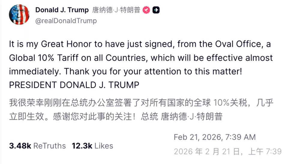 “我非常荣幸地刚刚在椭圆形办公室签署了一项全球10%的关税命令,适用于所有国家,该关税将几乎立即生效。感谢您对此事的关注!”