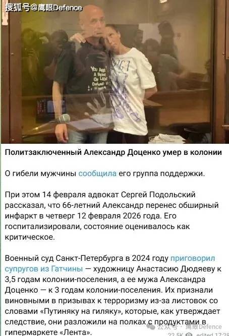 上个月25日,来自圣彼得堡的珠宝艺术家亚历山大·多岑科在监狱里因心梗去世,享年65岁,亚历山大·多岑科和妻子阿纳斯塔西娅去年7月因在超市货架上放置写有“XX上绞刑架”的乌克兰语传单,被俄罗斯法院以“煽动恐怖主义”的罪名分别判处3年和3.5年监禁,庭审时,阿纳斯塔西娅穿的体恤上绘有XX在海牙监狱的图案。