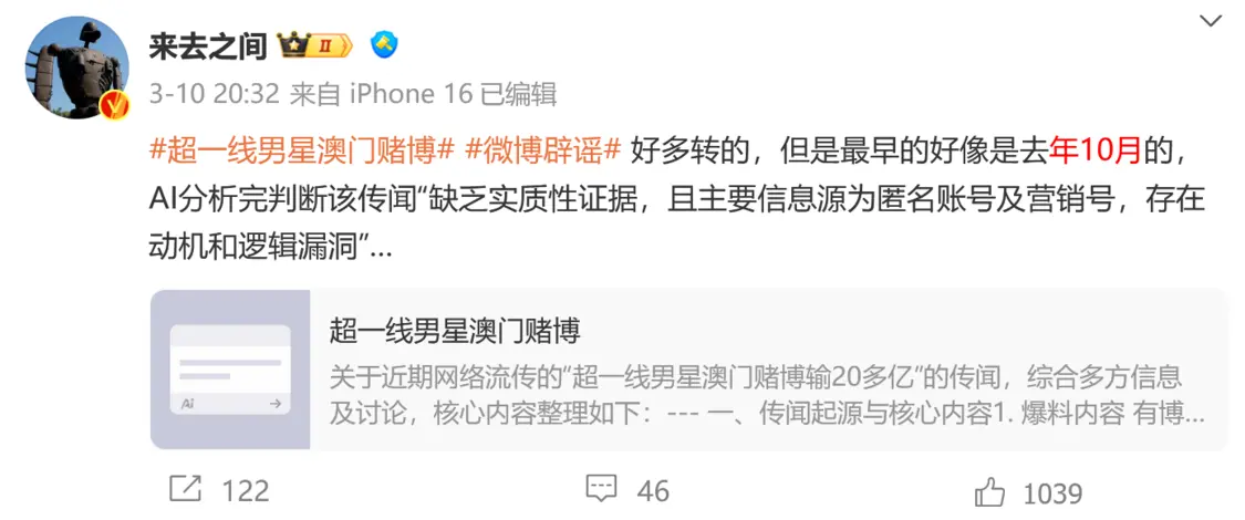 微博首席执行官王高飞@来去之间 发文表示:好多转的,但是最早的好像是去年(2024年)10月的,AI分析完判断该传闻“缺乏实质性证据,且主要信息源为匿名账号及营销号,存在动机和逻辑漏洞”。