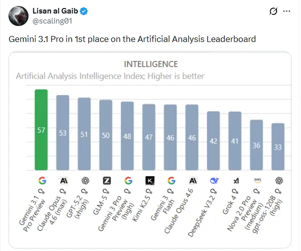 在Artificial Analysis的智能指数测试中,Gemini 3.1 Pro吊打对手