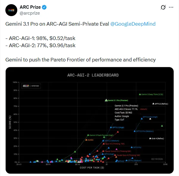 就在2026年2月19日深夜,谷歌带着名为“Gemini 3.1 Pro”的新模型杀了回来。官方数据看着挺吸引人:在一项衡量AI解决全新逻辑问题能力的“怪考题”ARC-AGI-2上,Gemini3.1 Pro的得分直接翻了一倍多,冲到77.1%。