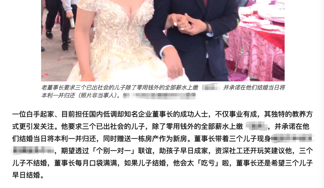 有位企业家父亲立下家规:儿子工作后的收入统一上交,等结婚当天连本带利返还,外加一套新房,用最资本主义的方式完成最传统的目标。