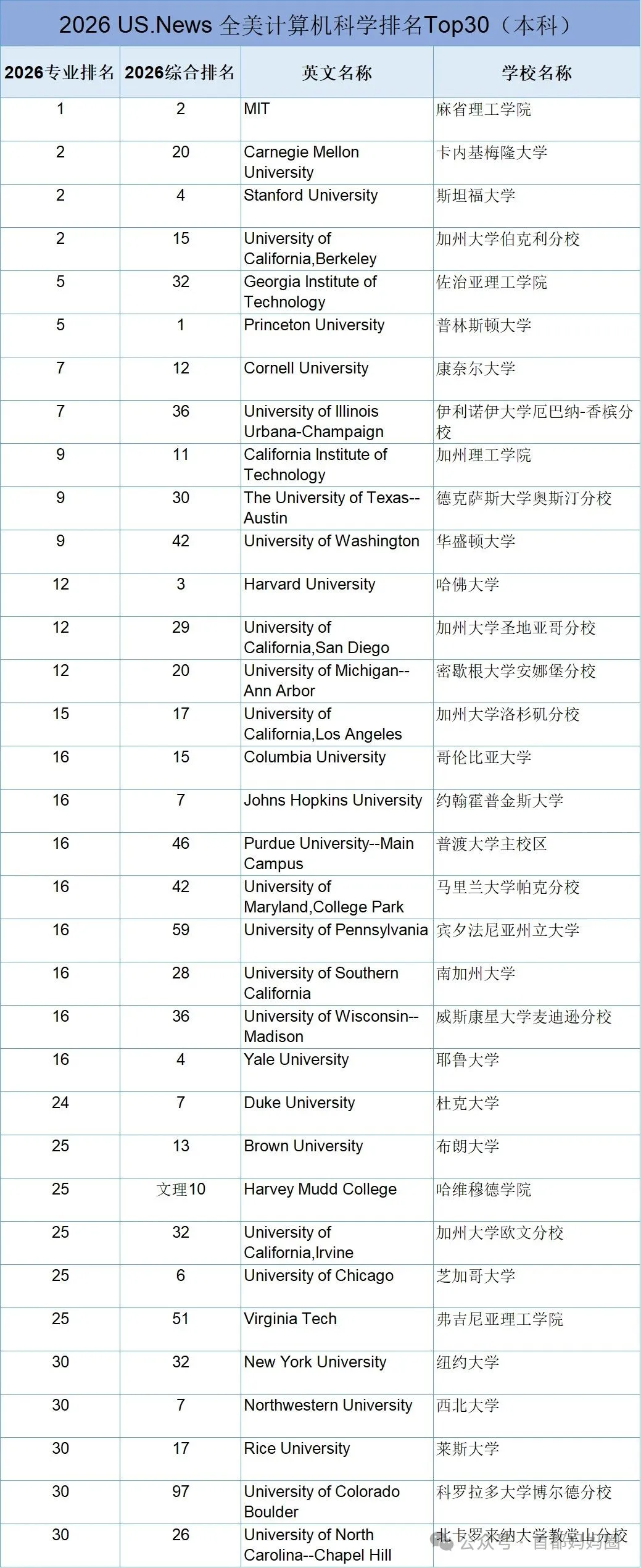 2026年美本计算机专业排名稳居前三,依旧是MIT、斯坦福、卡梅稳居宝座。