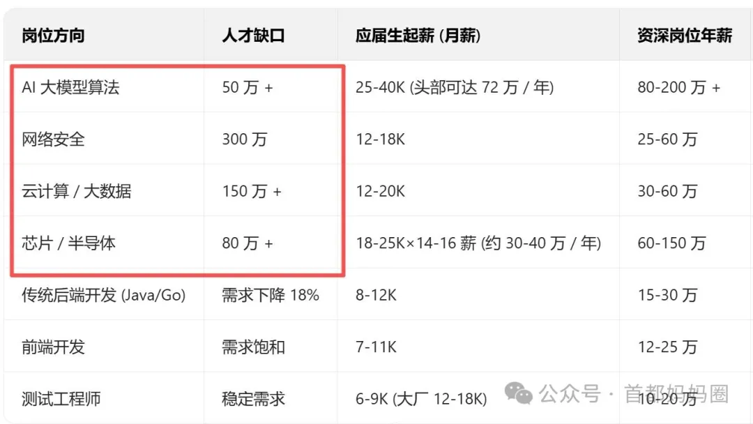 T1 级:算法工程师 (25-50 万 / 年)、网络安全架构师 (40-50 万 / 年),硕士学历是门槛