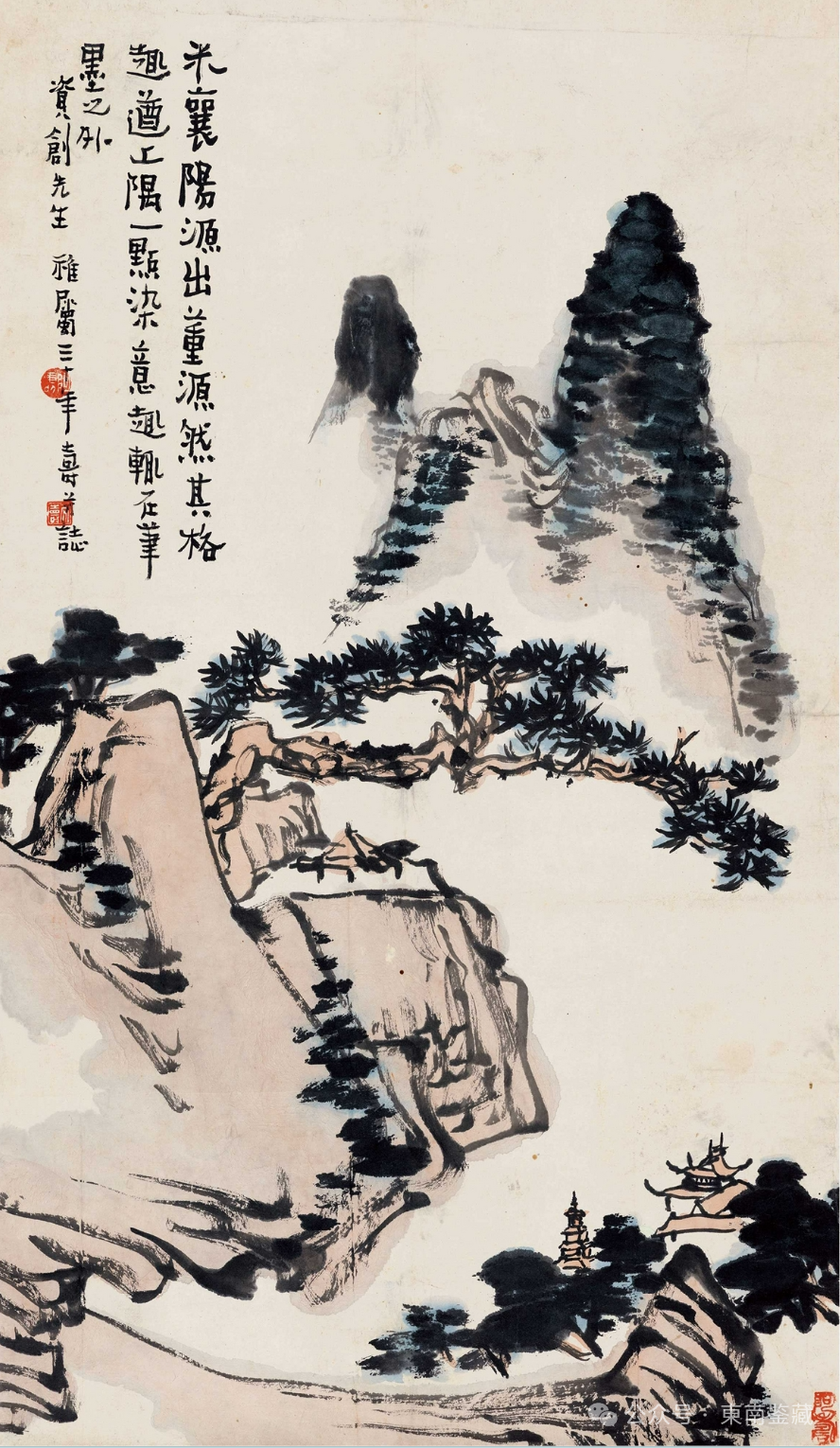 《拟米家山水》中,另可见罕少出现于潘氏同时期作品中的隶书款识。自1915年,潘天寿考入浙江省立第一师范学校,受教于经亨颐、李叔同后,因二师书法都以学碑为主,潘天寿亦因此逐渐跳出帖学藩篱,开始于先秦、汉魏书法着力,进入碑学的新阶段。画面左上方款识“米襄阳源出董源”数句,以汉隶为基调书就,开创性地融入《爨宝子》等碑学一脉书风,结体活泼、欹侧奇崛。使人耳目一新之余,与“潘家样”之云山相得益彰。
