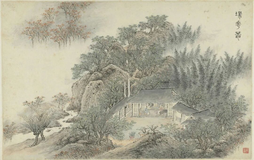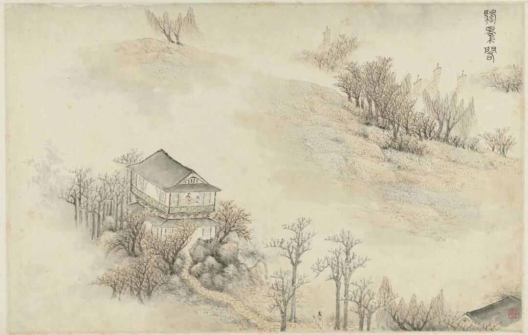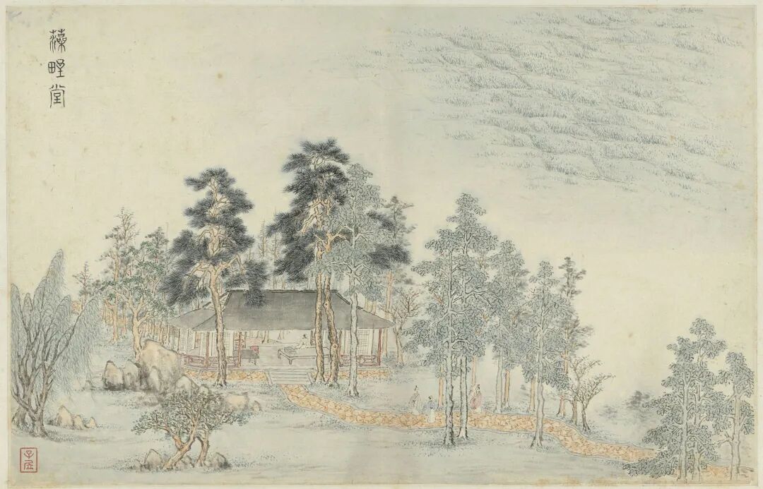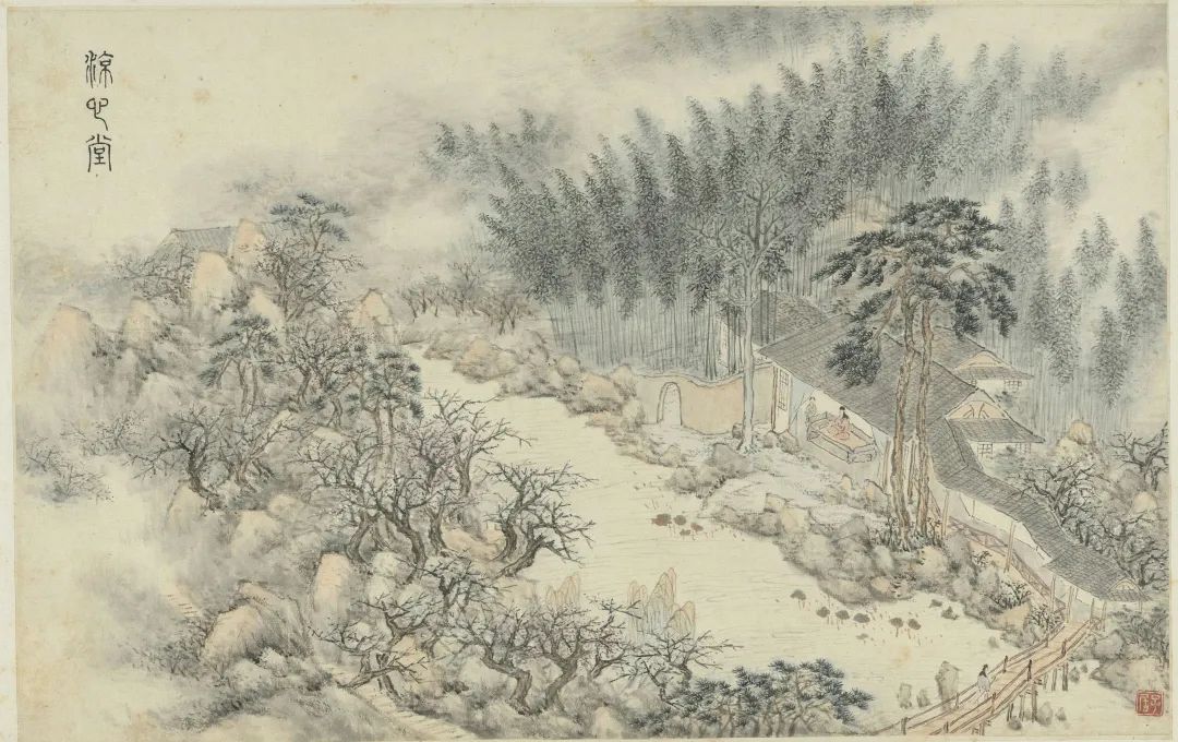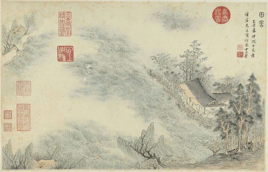 公元一六二五年,沈士充受王时敏之邀为其祖居东园作《郊园十二景图》。图中的十二景依次为:雪斋、秸阁、霞外、就花亭、浣香榭、藻野堂、晴绮楼、竹屋、扫花庵、凉心堂、聚景阁和田舍。