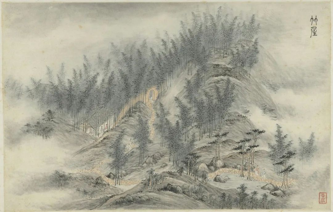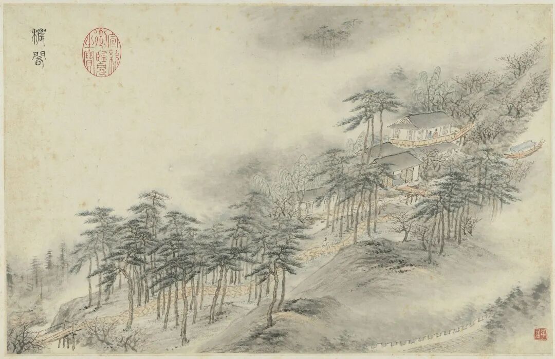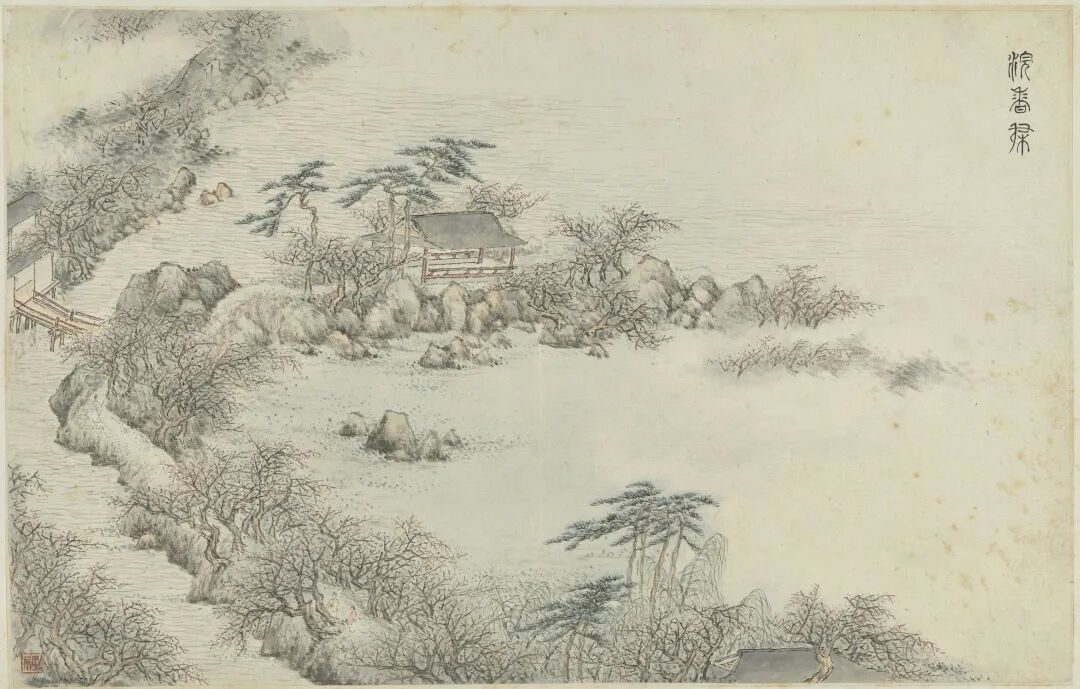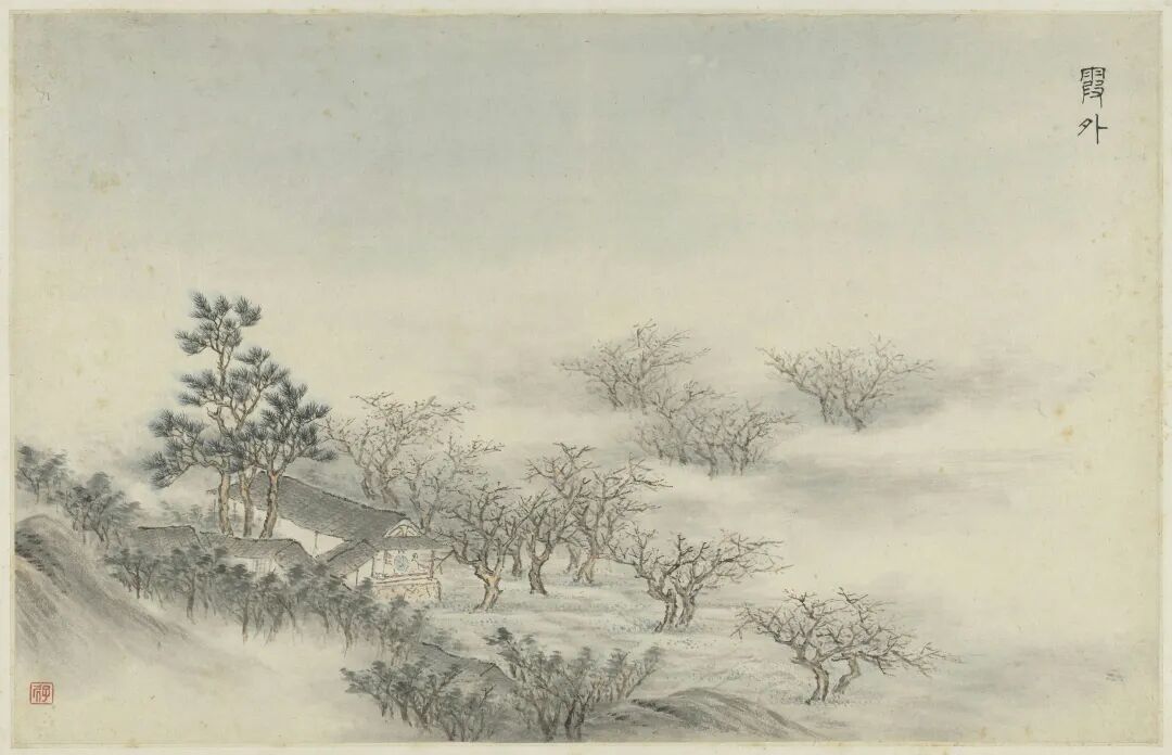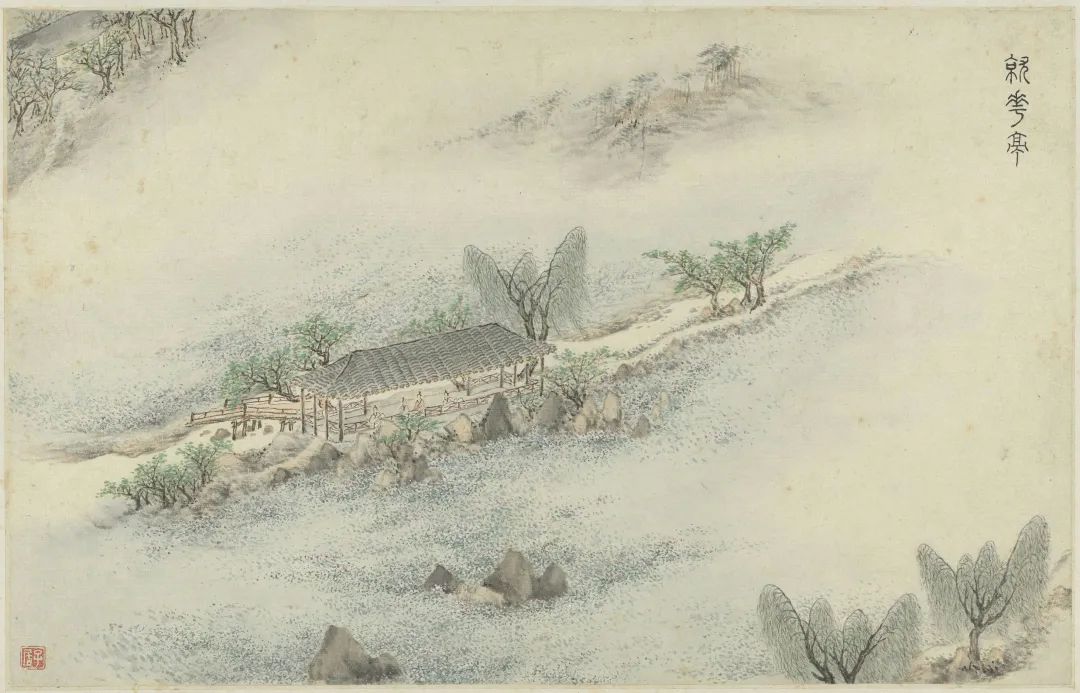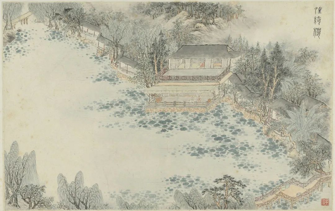 公元一六二五年,沈士充受王时敏之邀为其祖居东园作《郊园十二景图》。图中的十二景依次为:雪斋、秸阁、霞外、就花亭、浣香榭、藻野堂、晴绮楼、竹屋、扫花庵、凉心堂、聚景阁和田舍。