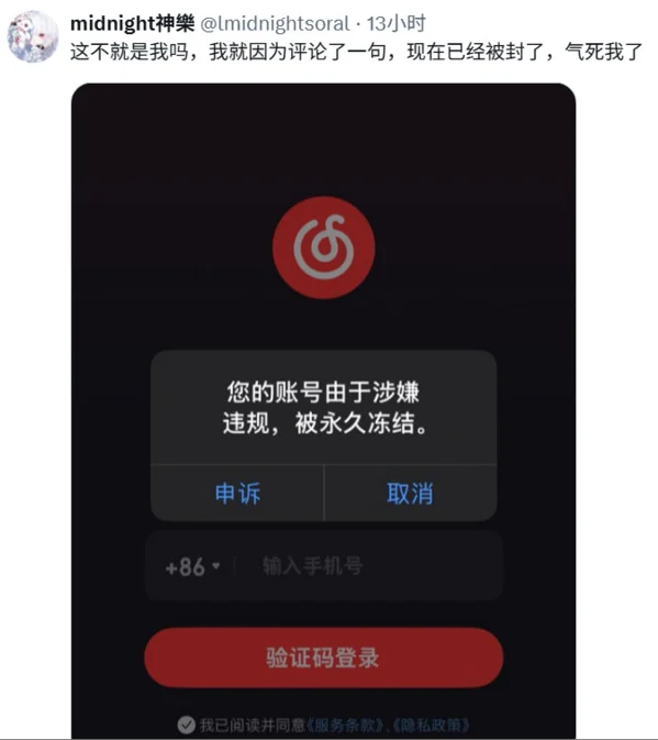 还有网友发帖称就因评论一句帐号被永久封禁。X网友“midnight神乐”:“这不就是我吗,我就因为评论了一句,现在已经被封了,气死我了。”该网友还在评论区说:“我谁都没有骂,我就问了放这个封面是何意味”。