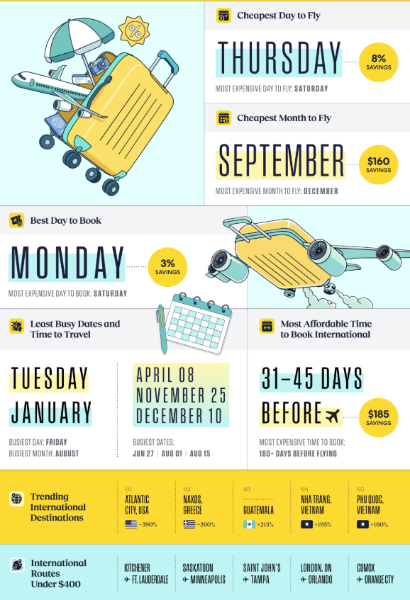 9月是飞行最便宜的月份,12月最贵(便宜26%,平均175加元)