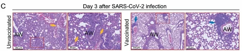 仅需三到四剂鼻内给药,小鼠在长达至少三个月的时间里,能够抵御包括 SARS-CoV-2 及其变异株、SARS 病毒以及多种蝙蝠来源的类 SARS 冠状病毒(如 SCH014)的攻击。接种疫苗的小鼠肺部病毒载量大幅下降,体重损失显著减少,存活率达到 100%,且肺部炎症与肺泡损伤程度明显减轻。
