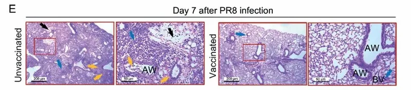 深入机制研究表明,疫苗的广谱防护效应源于其诱导的 “整合器官免疫”:一方面,疫苗激发产生的抗原特异性 CD4+ 和 CD8+ 组织驻留记忆 T 细胞(TRM)长期驻扎肺部,通过表观遗传重编程改造肺泡巨噬细胞(AMs),增强其抗原呈递、吞噬病原体及抗病毒能力;另一方面,感染后肺部会快速形成三级淋巴结构(TLS),加速免疫细胞聚集与协同反应,同时限制过度炎症(如细胞因子风暴),实现快速清除病原体以及减少组织损伤的双重目标。