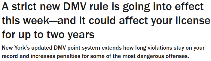 那么,如果在市中心拥堵的交通中穿梭,或者在纽约州北部驾车行驶,这意味着什么呢?简而言之:即使很少的罚单也可能带来更严重的后果。由于扣分现在以两年为周期累积,一次重大违章加上几次轻微违章,就可能导致驾照比以前更快地受到审查。州政府官员表示,此举旨在让“屡犯者”远离道路,并确保道路安全。