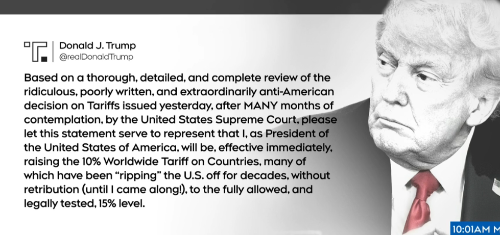 特朗普总统反复无常的关税威胁于周六继续,他承诺将把新的全球关税提高至15%,就在最高法院否决美国总统偏好的关税工具一天之后。