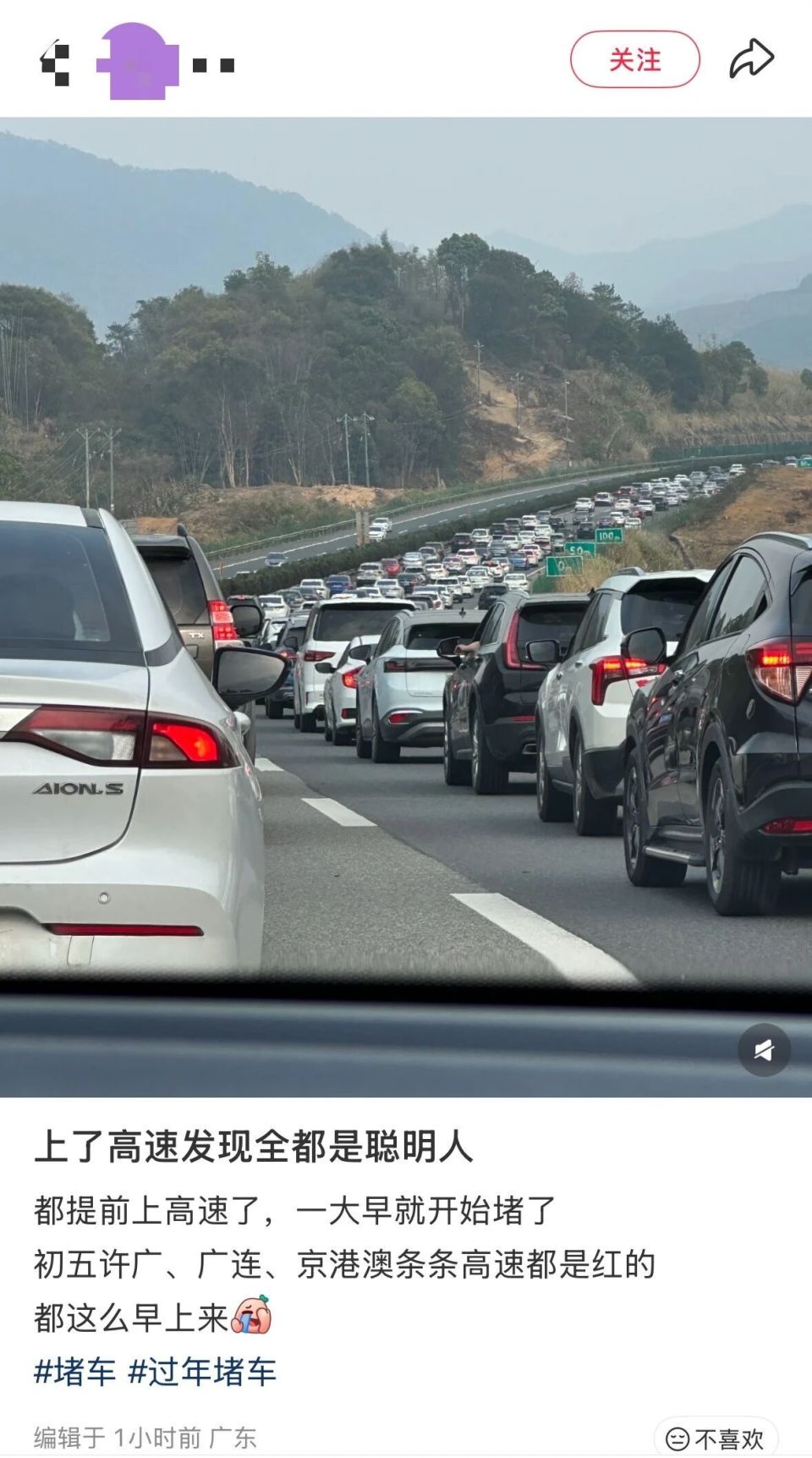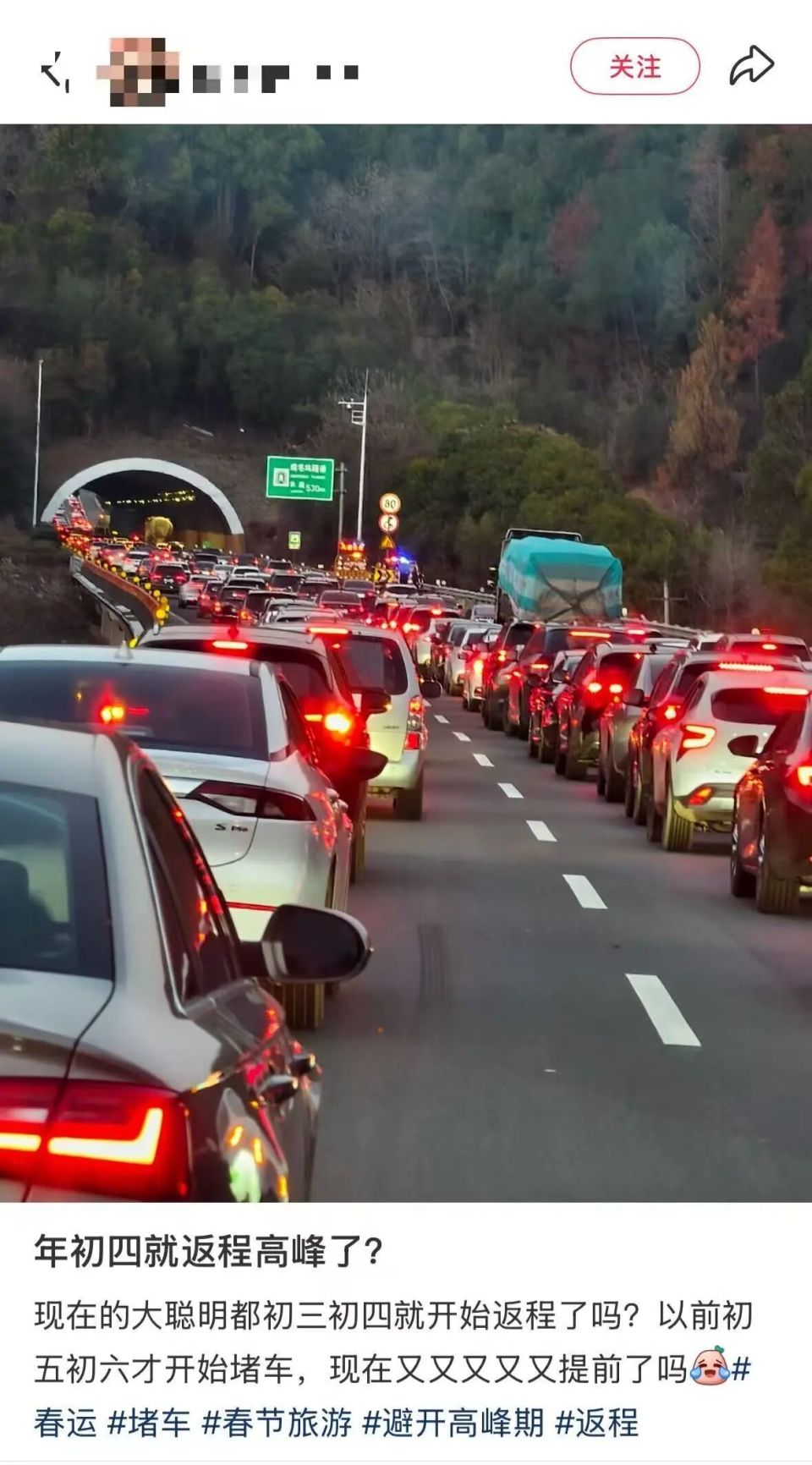 春节假期过半 返程高峰已来临 从2月20日(大年初四)开始 就已经有“大聪明”被堵在路上 🚗🚗🚗 网友晒图表示 “我以为初四这么早回去是个大聪明 结果还是堵在路上了” 今天也有不少网友表示 “才初五就已经堵在路上了” 小新在此提醒大家