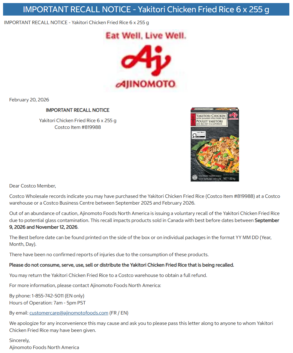 根据加拿大Costco官网周五(2月20日)发布的召回通知,味之素北美公司(Ajinomoto Foods North America)正对以下产品实施自愿召回:
