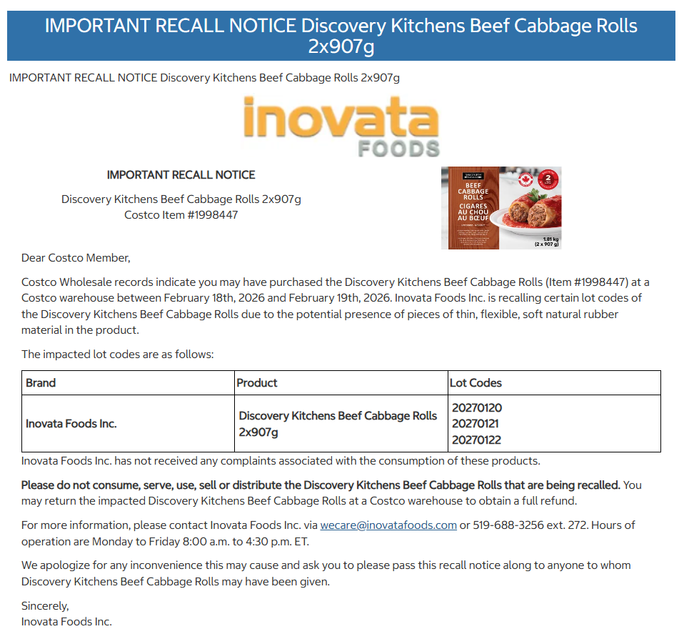 根据Costco官网发布的另一则召回通知,加拿大知名食品供应商Inovata Foods Inc.已自愿对特定批次的Discovery Kitchens牛肉包菜卷进行全国范围的召回。原因是生产过程中可能混入了细薄、柔软、有弹性的天然橡胶碎片。