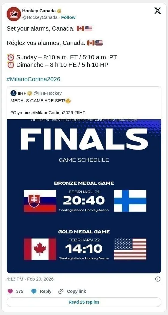 加拿大正力争自 Sochi 2014 Winter Olympics 以来的首枚男子冰球奥运金牌;而美国队则希望重现 Lake Placid 1980 Winter Olympics “冰上奇迹”以来的辉煌。当年美国队爆冷夺冠,创造历史。加美两国最近一次在“最强阵容对决”中交手,是去年的四国锦标赛,当时 Connor McDavid 在加时赛中进球,帮助加拿大取胜。