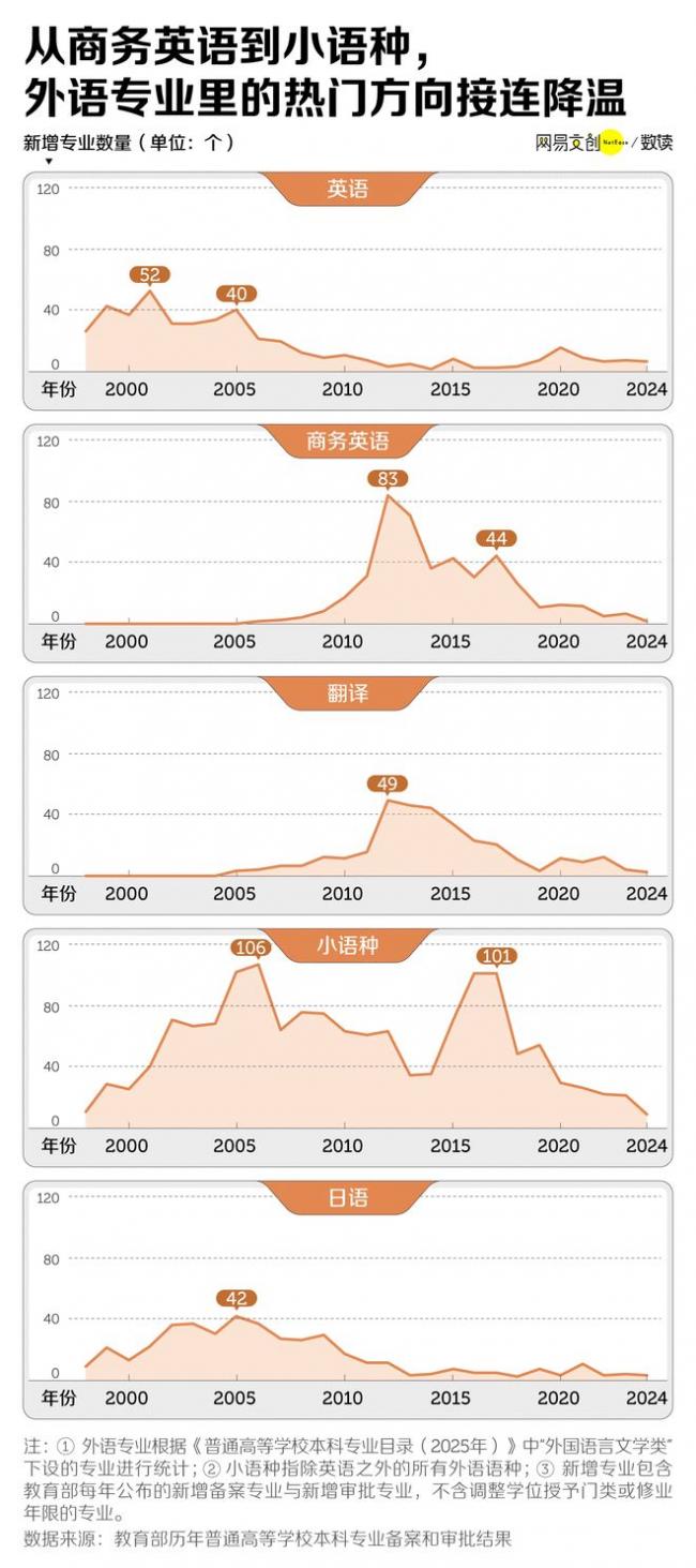 1998-2009年,全国新增了346个英语专业,日语几乎并驾齐驱,新增323个。彼时受益于日企在华扩张,叠加赴日留学升温,高校顺势一拥而上,日语成了英语之外最火热的小语种 [6]。